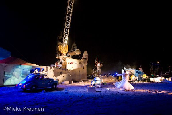 “tobetonotbe” werd gespeeld boven op de Coentunnel in Amsterdam–Noord. Een verlaten terrein van tribunes en hijskranen, verwrongen staal, bouwketen en beton. Beeld, muziek, humor, drama en technologie. Steeds veranderend, maar toch herkenbaar. Een typisch Dogtroep-landschap. Het laatste.